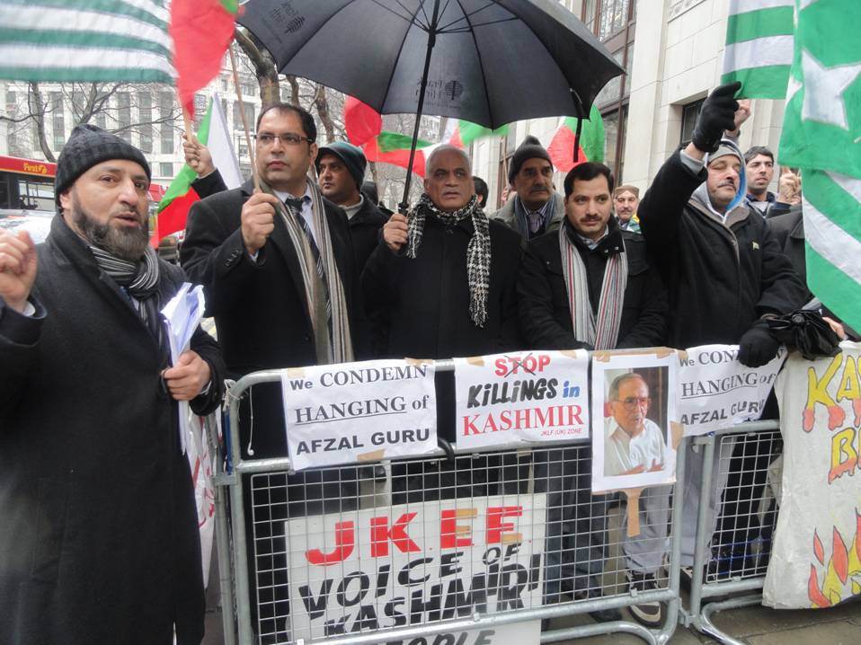To mark the 29th martyrdom anniversary of Maqbool Butt Shaheed, JKLF in Britain organized a protest rally in front of Indian High commission in London. Despite severe cold, hundreds of people including women and children from different cities of United Kingdom participated. Protesters shouted slogans of “Stop Killings in Kashmir”, “Handover remains of Maqbool Butt”, “Handover body of Afzal Guru” and in favour of complete independence of Jammu Kashmir. Three British Parliamentarians including Simon Donczuk MP, Lord Nazir Ahmed and Lord Qurban Hussain also joined the protesters.