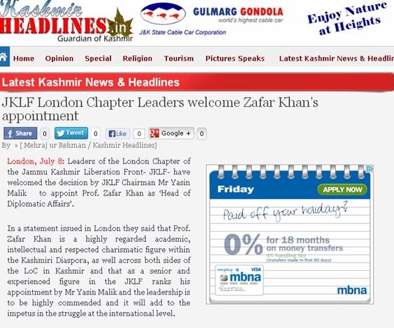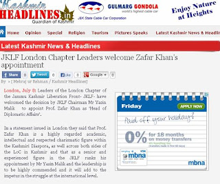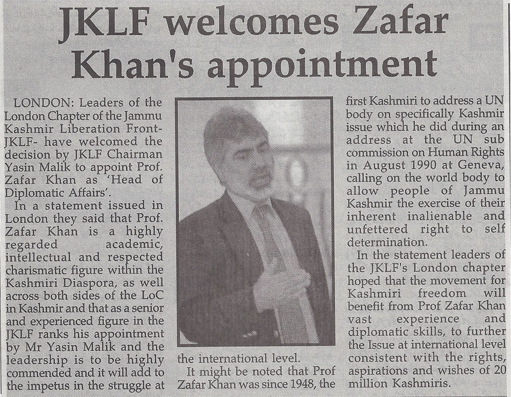 In the statement leaders of the JKLF's London chapter hoped that the movement for Kashmiri freedom will benefit from Prof Zafar Khan vast experience and diplomatic skills, to further the Issue at international level consistent with the rights, aspirations and wishes of 20 million Kashmiris.