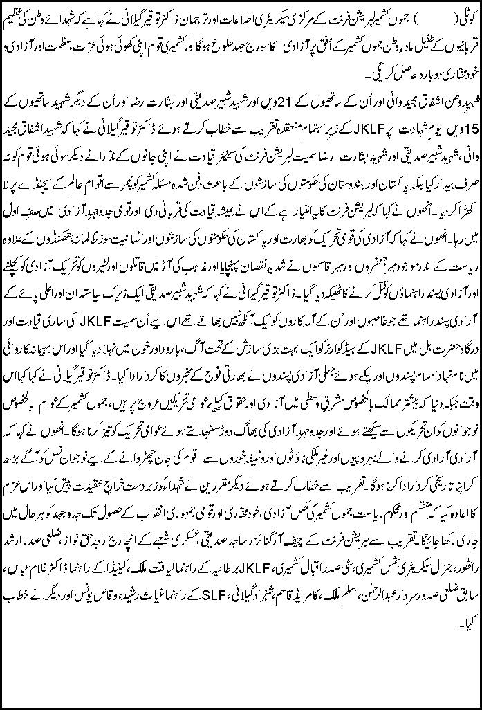 JKLF strongly believes that  an unresolved Kashmir issue is a perpetual bone of contention in South Asia and  must be resolved with due haste in accordance with the wishes, aspirations and above all unfettered  democratic expression of the people.