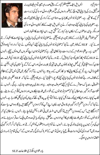 Jammu Kashmir Students Liberation Front (JKSLF) today organized protest demonstrations in Azad Kashmir against the kidnapping of 3 students from Muzaffarabad by inter services intelligence Pakistan(ISI).A Call for protests was given by JKSLF Central Committee on the day of Universal Declaration of Human Rights. Protest demonstrations were organized in almost all cities and towns of AJK. Hundreds of youth took part in protests chanting slogans against ISI and Islamabad and in favor of Freedom and human rights. Addressing the demonstrators in Muzaffarabad, Rawlakot, Bagh, Dhirkot, Kotli, Mirpur, Sarsawa, Hajira and Abbaspur, JKSLf leadership strongly condemned and criticized the Kidnapping of youth including former president JKSLF Muzaffarabad Raja Shahid Qayyum by ISI and said that ISI was involved in serious violation of Human rights in Pakistani Controlled Kashmir. JKSLF Leadership said that ISI wanted to control and subjugate people of AJK by spreading terror and fear among people especially youth. They said that ISI is a defeated agency and their stupid actions had already resulted in mass scale killings and massacre of common people in Pakistan itself. They said that Pakistani rulers wanted to strip the voices of freedom in AJK and by creating an atmosphere of terror they wished to complete their malicious agenda of division of Kashmir . JKSLF leadership Vowed to launch a world wide campaign against atrocities and human rights’ violations being committed by ISI in Pakistani Control Kashmir and Gilgit Baltistan. JKSLF leadership warned the concerned quarters that if the youths were not released immediately then the responsibility of Law and order situation in AJK would be solely on ISI and Rulers sitting in Islamabad .